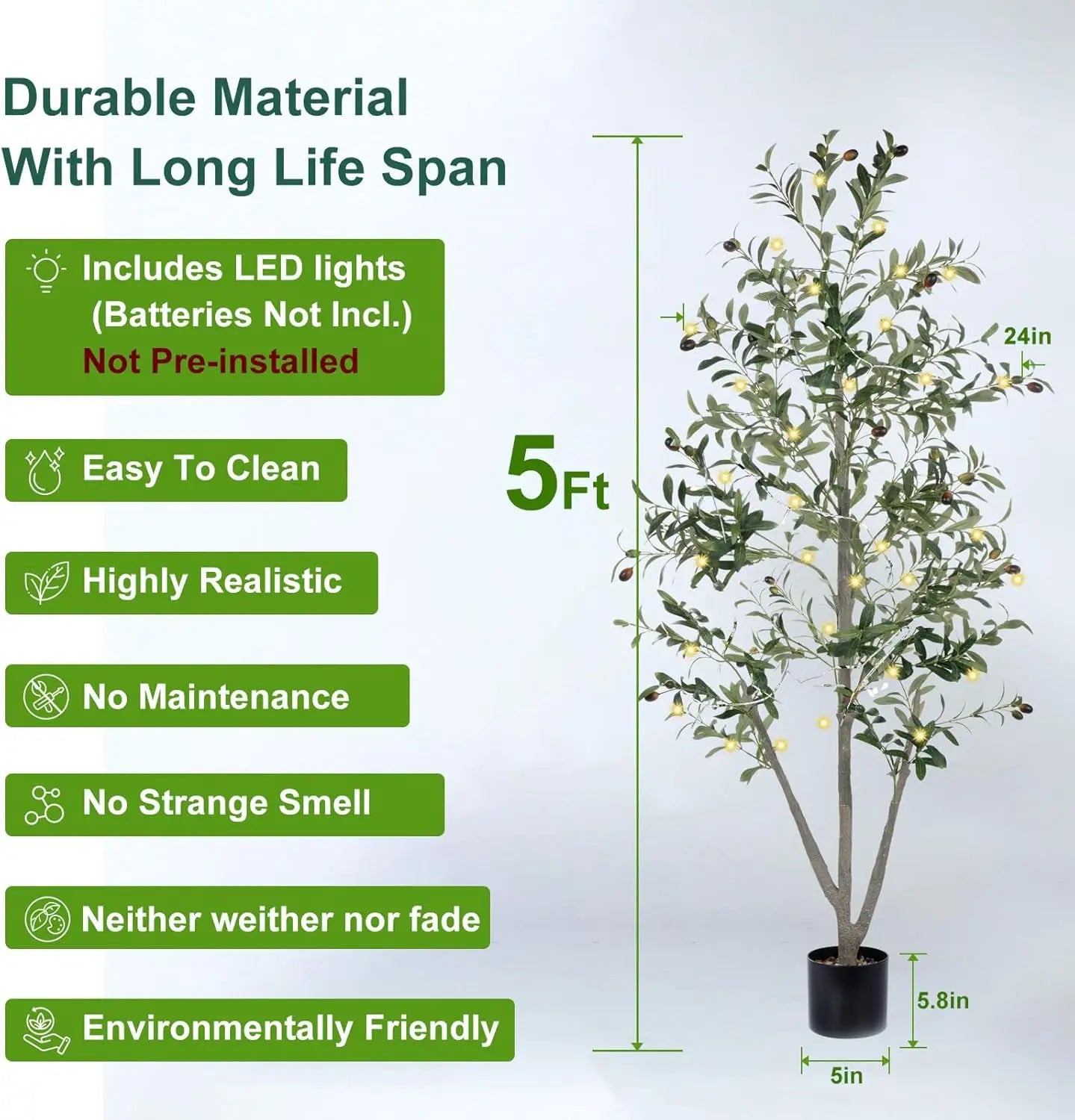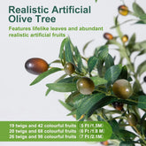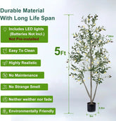 Transform your space effortlessly with this stunning 5-foot artificial olive tree. Designed to bring natural beauty indoors without any maintenance, this lifelike faux plant features realistic trunk details and vibrant fruits that add a touch of elegance to any room. Key Features: - Complete Decor Set: Includes a sturdy black planter, fresh-looking moss, and charming fairy lights (batteries not included). Everything you need for instant decoration—no additional accessories required. - Ultra-Realistic Design: Crafted with true-to-life textures and adjustable branches that allow you to shape the tree for a fuller appearance. The leaves sway gently to create a cozy, natural atmosphere. - Versatile Placement: Perfect for living rooms, bedrooms, offices, entryways, or commercial spaces like shops and malls. Its minimalist style blends seamlessly with all decor themes. - Zero Maintenance: No watering, pruning, or sunlight needed. Simply dust occasionally to keep it looking lush and vibrant year-round—ideal for busy individuals or those without time for real plants. - Easy Assembly: Pre-assembled in a durable pot with adjustable branches that insert quickly without tools. Set up in minutes and enjoy immediate decorative impact. - Long-Lasting Quality: Built to stay fresh and beautiful for years. Backed by a 3-year quality assurance policy and dedicated customer support available anytime for assistance. Why Choose This Artificial Olive Tree? This tall faux plant offers the perfect balance of aesthetic appeal and practicality. It elevates your home or office decor with its lifelike presence while eliminating the hassle of plant care. Whether as a statement piece or subtle accent, it adds color and comfort to any environment. An excellent gift choice for housewarmings, holidays, or everyday occasions—thoughtful, charming, and ready to delight anyone who appreciates stylish indoor greenery.