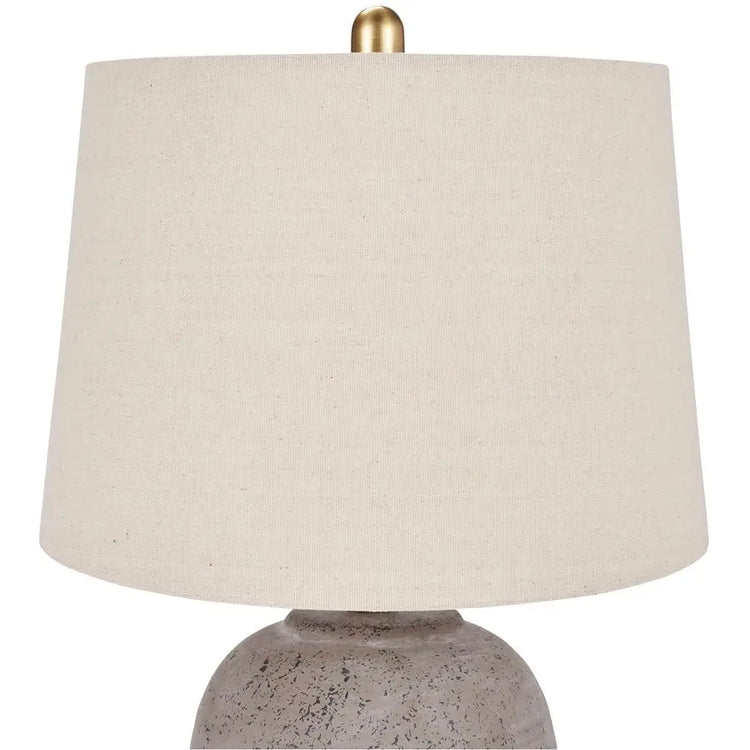 Vintage grey brown base with a distressed textured finish. Paired with a warm beige shade for a soft, ambient glow.